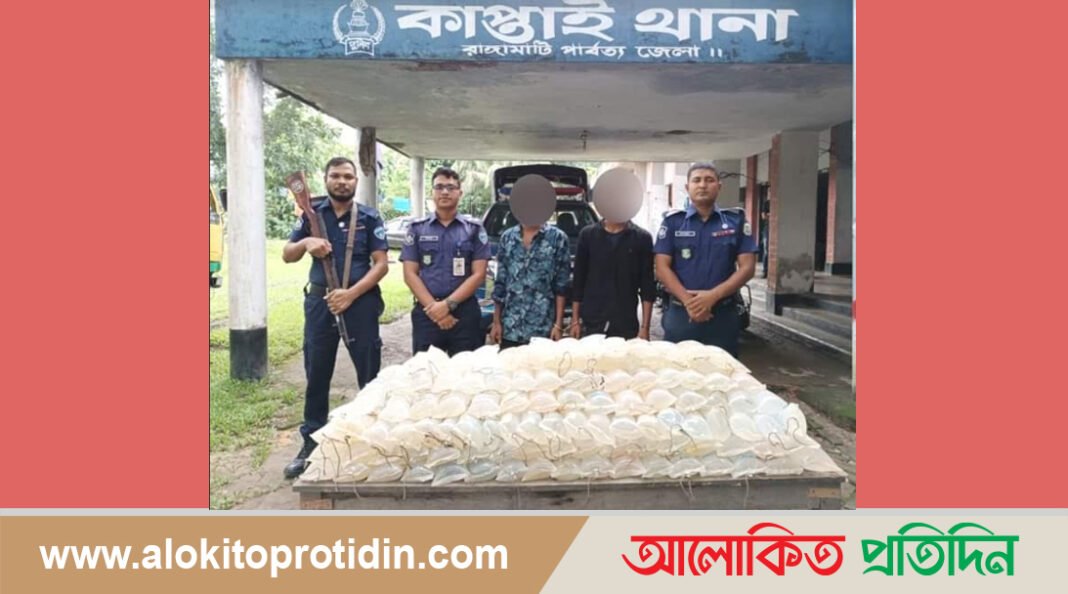 ১২ আগস্ট ২০২৩ খ্রি: রাঙ্গামাটি পার্বত্য জেলার পুলিশ সুপার  মীর আবু তৌহিদ, বিপিএম (বার) এর দিক নির্দেশনায় কাপ্তাই থানার অফিসার ইনচার্জের নেতৃত্বে এসআই (নিরস্ত্র) মোঃ ইমাম উদ্দিন সঙ্গীয় অফিসার ফোর্সসহ গোপন সংবাদের ভিত্তিতে কাপ্তাই থানাধীন ১ নং চন্দ্রঘোনা ইউপিতে বড়ইছড়ি মৎস্য চেকপোস্ট এলাকায় বিশেষ অভিযান পরিচালনা করেন। অভিযান পরিচালনাকালে, সন্দেহজনক একটি পুরাতন পিকআপ গাড়ি তল্লাশি করে  ৩০০ লিটার দেশীয় তৈরী চোলাইমদ পাওয়া যায়। এসময় মাদক ব্যবসার সাথে জড়িত  ব্যক্তি ১। মোঃ রবিউল হোসেন প্রঃ হৃদয় (২৭), ২। আকিব হোসেন (১৯) কে গ্রেফতার করা হয়। ৩০০ লিটার দেশীয় তৈরী চোলাইমদ ও ০১টি পুরাতন পিকআপ গাড়ি জব্দ করা হয়। উল্লেখ্য যে, গ্রেফতারকৃত অভিযুক্তদের বিরুদ্ধে আইনানুগ ব্যবস্থা গ্রহণ প্রক্রিয়াধীন।