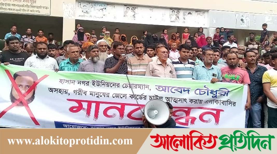 জেলেদের চাল আত্মসাতের অভিযোগে ইউপি চেয়ারম্যান আবেদ চৌধুরীর বিরুদ্ধে মানববন্ধন