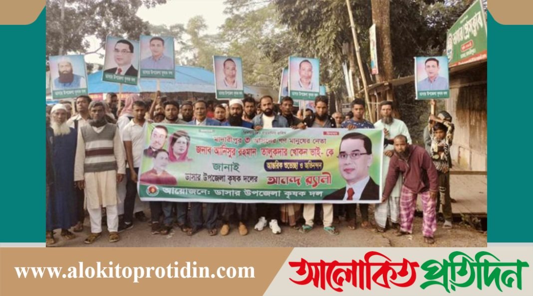 সৈয়দ মোকারাম হোসেন (হেমায়েত): মাদারীপুরের ডাসার উপজেলা জাতীয়তাবাদী কৃষক দলের আহবায়ক কমিটি ঘোষনা করায়, নবগঠিত আহ্বায়ক কমিটির সদস্য সচিব মোঃ আরিফ বিল্লাহ নেতৃত্বে আনন্দ মিছিল, মিষ্টি বিতরন ও আলোচনা সভা অনুষ্ঠিত হয়েছে। রবিবার (২৪ নভেম্বর) বিকেলে ডাসার উপজেলা কৃষকদলের নবগঠিত কমিটির সদস্য সচিব আরিফ বিল্লাহ্’র নেতৃত্বে মিছিলটি উপজেলার বিভিন্ন সড়ক প্রদক্ষিণ শেষে দক্ষিণ ডাসার পুরান থানা মোড় বিএনপির দলীয় কার্যালয়ে সংক্ষিপ্ত আলোচনা সভায় সদস্য সচিব মোঃ আরিফ বিল্লাহ্ বলেন বিগত ফ্যাসিস্ট সরকারের মিথ্যা এবং হয়রানি মূলক তারেক রহমানের উপর বিভিন্ন মামলার নিঃশর্ত মুক্তি দাবি করেন এবং অবিলম্বে অন্তবর্তী কালীন সরকারের কাছে নির্বাচন দাবি করেন শেষে মিষ্টি বিতরনের মধ্যদিয়ে অনুষ্ঠান শেষ করা হয়। এসময় উপস্থিত ছিলেন, কমিটির সিনিয়র যুগ্ম আহবায়ক টিটু শেখ, যুগ্ম আহবায়ক মাহবুব হাওলাদার সহ অঙ্গসংগঠনের অন্যান্য নেতৃবৃন্দ। জানা যায় গত ২০ নভেম্বর ডাসার উপজেলা কৃষক দলের আহ্বায়ক কমিটি ঘোষনা করা হয়, একটিতে আহ্বায়ক করা হয়েছে মীর হোসেনকে, সদস্য সচিব করা হয় আরিফ বিল্লাহকে। কমিটিতে ২০সদস্য বিশিষ্ট আহবায়ক কমিটি ঘোষনা করে মাদারীপুর জেলা কৃষকদলের আহ্বায়ক এ্যাড অলিউর রহমান দর্জি ও সদস্য সচিব অহিদুজ্জামান খান।