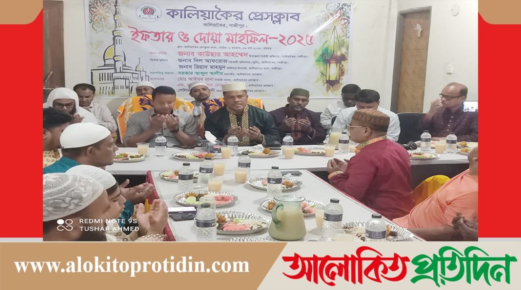 শাহআলম সিকদার কালিয়াকৈর প্রতিনিধি: গাজীপুরের কালিয়াকৈর উপজেলার মাকিষবাথান এলাকায় কালিয়াকৈর প্রেসক্লাবের উদ্যোগে গতকাল (৯ মার্চ, ২০২৫) রবিবার রোজ ৮ রমজান প্রেসক্লাব ভবনে এক ইফতার ও দোয়া মাহফিলের আয়োজন করা হয়। প্রেসক্লাবের সভাপতি সরকার আব্দুল আলিমের সভাপতিত্বে কালিয়াকৈর প্রেসক্লাবের সাধারণ সম্পাদক মোঃ সেলিম হোসেন সানির পরিচালনায় অনুষ্ঠিত ইফতার ও দোয়া মাহফিলে প্রধান অতিথি হিসেবে উপস্থিত ছিলেন কালিয়াকৈর উপজেলা নির্বাহী অফিসার কাউছার আহম্মেদ। বিশেষ অতিথি হিসেবে উপস্থিত ছিলেন কালিয়াকৈর থানার অফিসার ইনচার্জ রিয়াদ মাহমুদ।